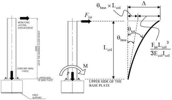 Each specimen was analyzed under the action of a lateral load applied parallel to the column’s web. Additionally, a constant compression axial load equal to 50 [T] was applied. The lateral load was applied monotonically following the scheme of a displacement protocol. These displacements were applied at 2 m above the top of the base plate, corresponding approximately to the inflection point in a column of moment resistant frame with fully fixed supports.