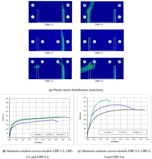 As shown in Figure 5a, three failure mechanisms were obtained in which inelastic incursion of two or more components simultaneously occurs in the tensile and compression zones. The first failure mechanism consisted of a fracture of the anchor rods in the tensile zone and concrete crushing in the compression zone. This failure mode is representative of the response observed in simulations UBP-1-3 and UBP-1-6. Moderate yielding was observed in the base plate. A second failure mechanism occurs due to the formation of a plastic joint line in the compression zone of the base plate, accompanied by the tensile fracture of the anchor bars. This fault mechanism was observed in the UBP-1-2 simulation. The third mode of failure occurs due to the initial formation of a plastic joint line at each end of the base plate, which are subsequently accompanied by the fracture of the anchor bars. In this case, high levels of inelastic deformation are observed in the base plate (0.13 mm/mm), which indicates that the base plate has reached its fracture tension. This behavior is observed in the simulations corresponding to models UBP-1-1, UBP-1-4 and UBP-1-5 (see Figure 5b).