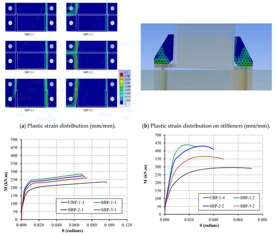 Figure 7a shows that the greater the amount and location of the stiffeners, the more significant the changes in the failure mechanism experienced by the connection. These changes were more relevant in the tensile zone of the models with high strength anchor bars, in which yield was mainly concentrated in the base plate, reaching high levels of plastic deformation (0.10 mm/mm).