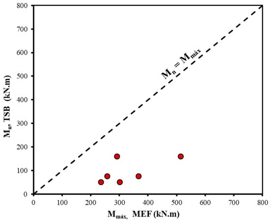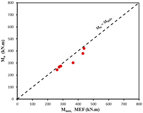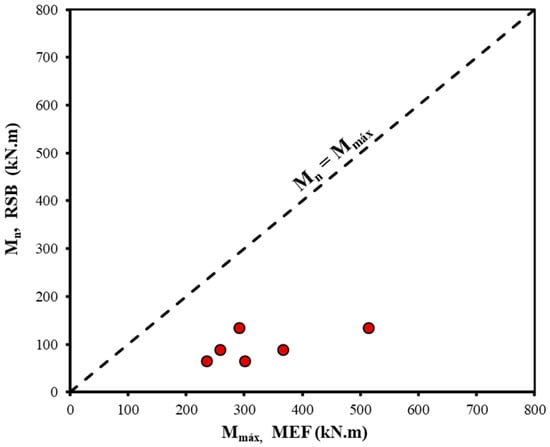 The flexural strength calculated from non-stiffened base plates by applying the proposed method are compared with the results of FE model results are presented in Figure 11. An acceptable level of coincidence was observed with differences smaller than 5% for non-stiffened base plates, obtaining a better prediction than the one obtained by applying TSB, RSB and EC3. In the case of stiffened base plates, the flexural strength obtained by applying the proposed method achieved an acceptable match with the results of FE simulations, with differences smaller than 5%, as shown in Figure 12. This kind of stiffened base plate configuration is not considered by traditional methods.