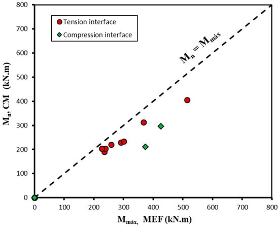 The third method, the component method (CM) [], quantifies the bending strength of the connection from the strength capacity of each element that forms the connection. In all the cases considered by this method, the bending strength is controlled by the flexural yielding of the base plate at the tension interface, except for the cases UBP-2-3 and UBP-2-4, where strength is controlled by the flexural yielding of the base plate at the compression interface.