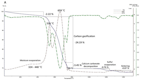 At the same time, the peak at 710 °C can be related to the calcination of calcium carbonate [12]. The zinc contained in the BF sludge evaporated at 785 °C [16,17]. This is consistent with the results obtained by Ökvist et al. [13]. At a temperature of 1225 °C the sulfur evaporated from the BF sludge, as verified by the S spectrum curve. The reaction at 1330 °C, associated with mass loss, was due to the sample sintering.