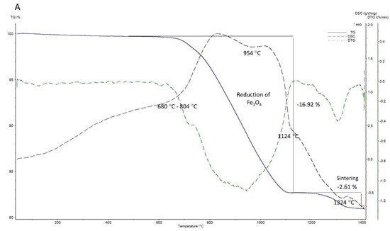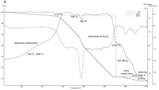The broad endothermic peak at the early stage of heating, between 130 and 460 °C, is attributable to the elimination of moisture from the sample. About 1.52% mass loss was measured due to the evaporation of water. The endothermic reactions from 710 °C to 1115 °C are related to the reduction of hematite to metallic iron.