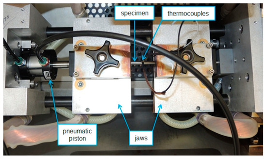 Photograph of a specimen fixed between special jaws with pneumatic pistons for the determination of nil-strength temperature in the plastometer Gleeble 3800.