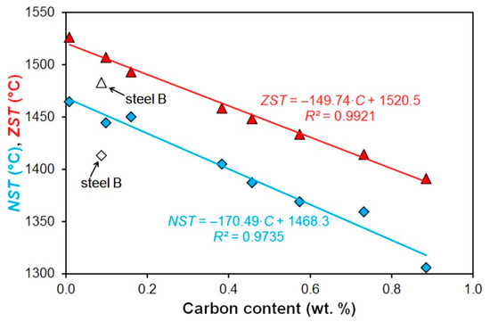 Support for these claims can be found in Figure 7 which graphically compares the ZST or NST values determined by various authors. Only the indisputable ZST values were located by digitizing the previously published graphs [39,40,41,42]. In this case, TS value corresponds to the equilibrium solidus temperature in the Fe-C binary diagram and thus does not reflect the influences of other chemical elements. This was reflected in the less accurate linear dependence NST = f(TS)—compare in Figure 6. The values of ZST determined by using of IDS software and the values of ZST determined in [40] were practically the same. All datasets exhibits a linear dependency, but with different slopes and intercepts. The key is that for comparable carbon and solidus temperatures, relationship ZST > NST is valid. Therefore, the values ZST and NST must be considered to be fundamentally dissimilar, which is mainly due to the different methodology of their determination. Moreover, these material characteristics may be affected by the rate of temperature change during the test [43].
