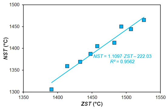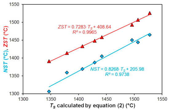A regression analysis of the relation of the nil-strength and zero strength temperatures with the solidus temperature of the investigated carbon steels has been consequently performed. For these purposes, the solidus temperatures calculated only by using Equations (2) and (3) have been used, because by using these two equations, similar results were achieved. The paper [1] experimentally verified the possibility of the use of Equation (3) for determining the solidus temperatures of steels with a wide range of chemical compositions. The solidus temperatures determined according to the Equations (1) and (4) were excluded from the consequential analyses because they showed the aforementioned inaccuracies already. The solidus temperatures determined with the use of the IDS software were also excluded from these analyses because the calculating module of this software does not use simple parametric equations (expressing an influence of the chemical composition) for the calculation of a solidus temperature, but uses thermodynamic equations, an equality of the chemical potentials, the inter-phase weight of the balance and Fick’s second law.