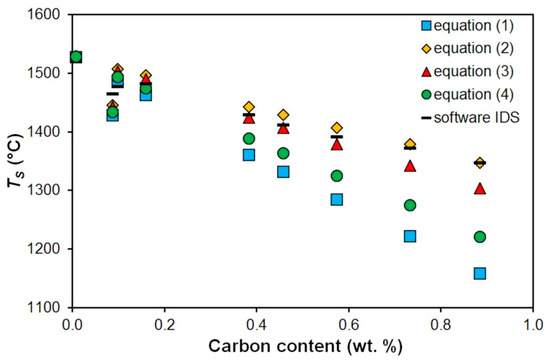 Methods of the study of the metallurgical processes are based on knowledge of the thermodynamic properties of the materials during their processing by the given technologies. Important temperatures for steel heating and cooling can be determined mathematically or using simulations in specially developed software products; for example, IDS (version 2.0.0, Laboratory of Metallurgy, Helsinky University of Technology, Helsinky, Finland), Thermo-calc, QTSteel, JMatPro and so on. [18,19,20,21,22,23]. To calculate the solidus temperature, it is possible to use parametric equations, which are based on the melting temperature of pure iron (usually 1536 °C, according to some data; however, from 1528 to 1539 °C) and include the influences of the elements selected in the steel being invetigated. The determination of the solidus temperature on the basis of the computational equations—compared with the experimental determination—is a simpler, quicker and financially non-demanding method. The validity of each equation is, however, limited by a range of the chemical composition for which the given equation was developed [3,4,24,25].