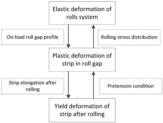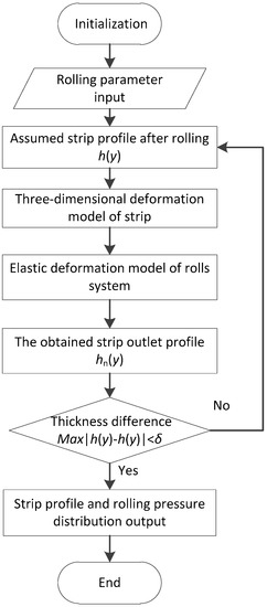 In the process of cold rolling, the three-dimensional deformation of the strip edge metal is complicated. The forming of the strip edge shape is obtained by coupling elastic deformation of the roll and three-dimensional deformation of the strip. The rolling pressure distribution of the strip along the width is uneven, which will cause uneven elastic deformation of the roll. The uneven deformation of the roll will affect the transverse flow of the metal at the edge of the strip, which will cause the uneven distribution of tensile stress after the strip rolling and further affect the distribution of rolling pressure. This is a cyclic iteration of the impact and calculation relationship, as shown in Figure 2. According to the interaction between the roll and the strip during rolling, a flow chart of the mathematical calculation model for the roll and the strip is illustrated in Figure 3.