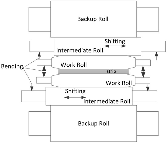 Most recently, the authors enjoyed the privilege of partnering with a silicon steel strip manufacturer with the purpose of improving a non-oriented silicon steel (Si < 3 wt.%) strip profile. The producer owns a pallet consisting of a six-high reversal mill shown in Figure 1 with a larger work roll diameter. The six-high mill is the most commonly used equipment for cold rolling of silicon steel. The cause of the strip edge-drop is the flattening deformation of the roll. Many of the above tapered work roll contours are used to improve the edge profile of the strip, but the effect is limited. In cold rolling mill equipment, a high-strength steel strip can be produced using mills equipped with more rolls (such as 12 high and 20 high mills) with the smaller work roll diameter, which can not only reduce the rolling load but also increase the stability of the roll system to ensure the shape quality of the strip profile. Based on the existing rolls system structure of the rolling mill (six-high reversal mill), the possibility of reducing the work roll diameter was explored to improve the equipment’s ability to produce a non-oriented silicon steel strip with a higher silicon content and better thickness accuracy, and, at the same time, the equipment transformation cost was relatively low. In addition, the ability of the tapered work roll to control the strip edge shape under different work roll diameters also needs to be analyzed and studied. It has become the most effective tool for producing a high-grade silicon steel strip compared to other rolling mill configurations.
