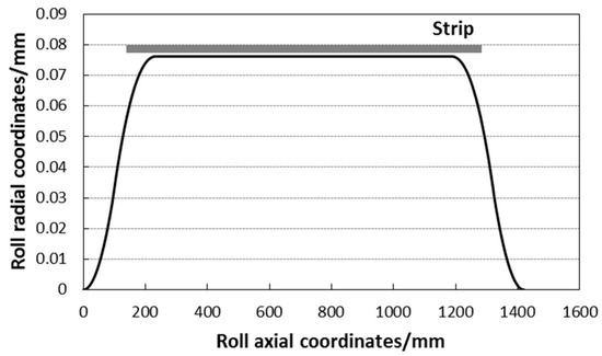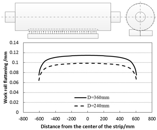 The mechanism of edge drop improvement of a small work roll radius is further analyzed. It can be found that the elastic flattening amount on the surface of a large-diameter roll obviously exceeds that of a small-diameter work roll. As shown in Figure 7, the difference in the flattening amount of the roll along the width of the strip calculated is 16 μm. As the contact position with the edge of the strip is the connection section of the flattening zone and the non-flattening zone, a large amount of flattening will cause the rise in the edge drop of the strip. This is particularly true within a 200 mm distance from the edge of the strip.