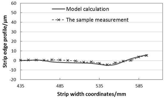 In order to verify the calculation accuracy of the established calculation model, the measurement results of industrial strip samples are compared in this paper. The samples were selected from the first rolling of the non-oriented silicon steel named 50SW800. The shape profile was measured by an automatic thickness gauge with a grating sensor. The resolution of the instrument was 1 μm and the error range was ±1 μm. The section profile of the strip between rolling passes was measured in practice. Then, the model calculated value of the first rolling step was compared to the measured value, as shown in Figure 6. The strip indicated in the figure is a half-width edge profile.