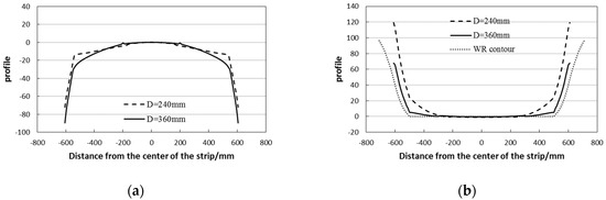 Comparison of profile calculation results with different work roll diameters: (a) No work roll contour; (b) with work roll contour.
