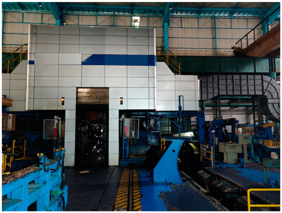 The Maanshan Iron & Steel Company Ltd. in Maanshan city, Anhui province, China, is equipped with two 1420 mm six-high reversible cold rolling mills to accommodate the production of different types of silicon steel strip, as shown in Figure 9. The allowable range of work roll diameters of the two mills is different. It is 230 to 260 mm for the No.1 mill and 340 to 360 mm for the No.2 mill. The No.1 mill has been modified and can be equipped with small-diameter work rolls. The actual production data of non-oriented silicon steel in Table 3 serve to illustrate the influence of the work roll diameter on the strip shape. The chemical composition of selected samples is shown in Table 4, and the magnetic and mechanical properties requirements are shown in Table 5. The shape profile was also measured by an automatic thickness gauge with a grating sensor.