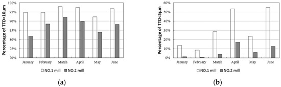 Statistics of transverse thickness difference (TTD) of strip produced by two rolling mills: (a) Less than 10 μm; (b) less than 5 μm.