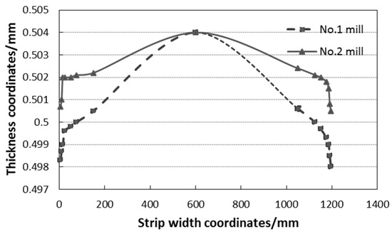 The typical cross-sectional profile of the non-oriented silicon steel sample rolled by the two mills is illustrated in Figure 11. At this time, the same roll shape curve is utilized on the work rolls of the two mills. It can be observed in the figure that the thickness change of the strip edge affected by work roll shape is very little. The difference in transverse thickness between the two templates is mainly reflected in the middle region, which is consistent with the simulation results in Section 3.1, that is, the elastic flattening caused by different work roll diameters is different, thus affecting the section shape of the strip.