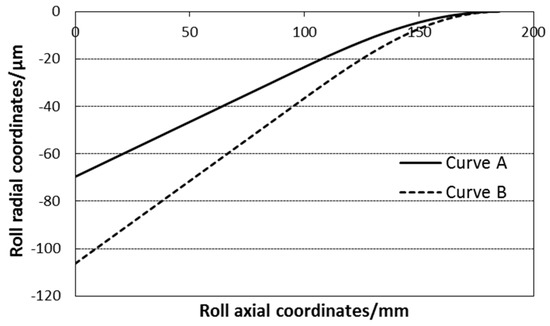The calculation results with two kinds of work roll diameter in the first rolling pass are given in Figure 8a where a horizontal line is used for the work roll curve (no special curve). It can be found that the strip shape with a smaller work roll radius is flatter and the crown is smaller. There is no obvious transition zone from the middle straight segment to the edge drop zone. The edge drop within the 60 mm area of the strip edge is 47.9 μm. However, for the mill with the large work roll radius, the strip edge drop is 54.4 μm and the overall strip crown is larger. The reduction of roll diameter can reduce the edge drop by 6.5 μm.