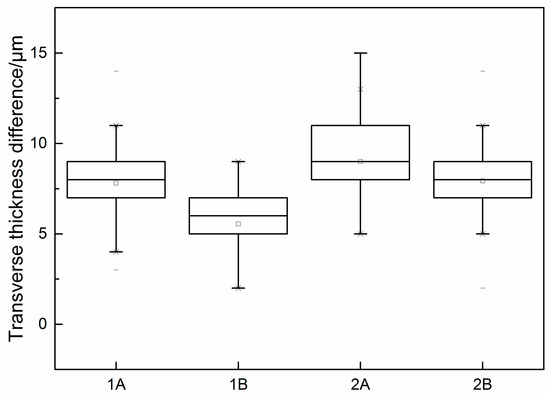 Box diagram of transverse thickness difference of strip under different parameters.
