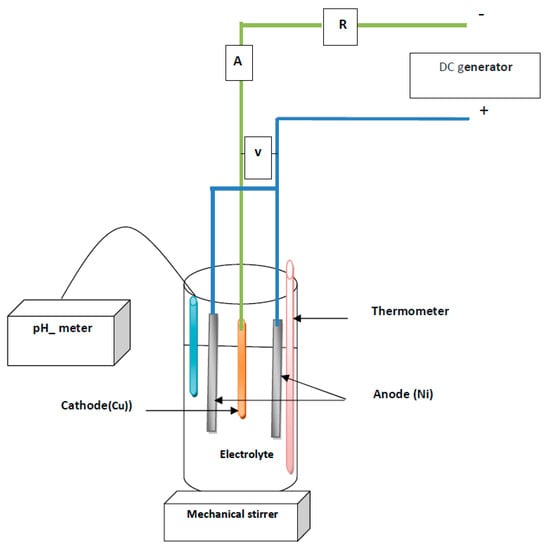Figure 1 shows the schematic representation of the setup used for the electrodeposition. The main elements are: DC generator, pH–meter, mechanical stirrer with magnetic bar, and thermometer.