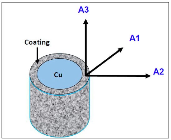 The purpose of the EBSD experiments was to determine whether or not any significant texture is resulted from the coating process. Specimens were prepared for EBSD analysis in a standard manner. A Zeiss Sigma HD FEG-SEM(Carl Zeiss Microscopy GmbH, Jena, Germany) operating at 20 kV coupled with the automatic OIMTM (Orientation Imaging Microscopy) software from TSL-EDAX Company (Mahwah, NJ, USA) was used for the sample cross section EBSD analyses. Figure 2 presents the schematic illustration of the studied area. The pole figures were calculated, using the harmonic series expansion method (series rank L = 22), from the orientations measured by EBSD. Let us remark that it was verified that higher L values do not modify significantly the texture intensity. Each orientation was modeled by a Gaussian function with a 5° half width. The EBSD maps are measured in the (A1, A2) plane, at the interface between the Cu substrate and the coating (Figure 2).