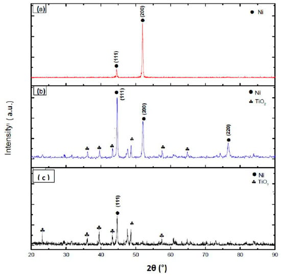However, with the presence of TiO2 nanoparticles in the nickel-plating bath, TiO2-peaks were recorded (Figure 3b,c). The incorporation of 5 g/L of TiO2 in the nickel-plating bath shows a preferential orientation of the Ni crystals, as the Ni (200) diffraction peak decreases, while the (111) peak increases in intensity (Figure 3b). The TiO2 peaks were revealed at low angles which is in agreement with the result of Benea and Danaila [29].