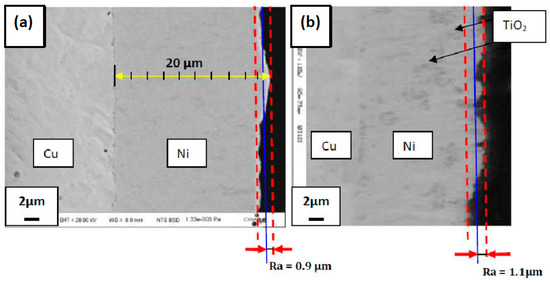 In addition, the surface roughness Ra is measured by applying the reported work [32]. Microroughness is formed by fluctuations in the surface. From Figure 4a,b, the value of Ra varies from 0.9 to 1.1 μm.