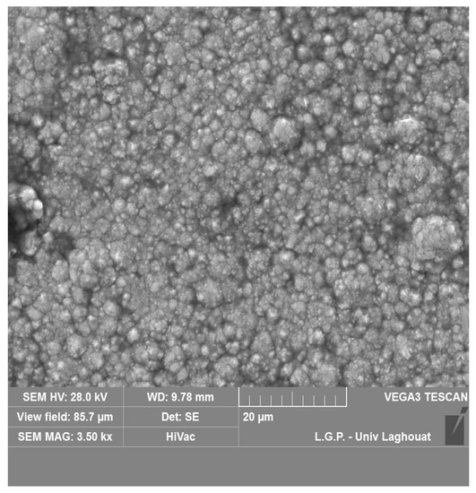 Figure 5 presents the surface SEM image of the electrodeposited nickel film. It shows a compact nickel coating and that is composed of grains covering the entire surface with a “cauliflower” growth appearance.
