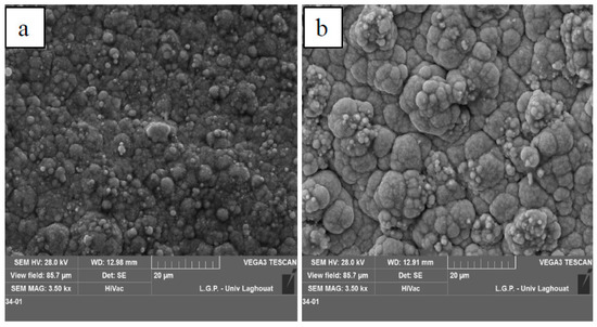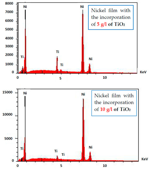 Figure 6 displays the SEM surface images of the electrodeposited nickel film on copper with the addition of 5 g/L of TiO2 (Figure 6a) and 10 g/L of TiO2 (Figure 6b). In addition, EDS analysis of the surfaces (Figure 7) confirmed the existence of Ti in the nickel film. For the high concentration of TiO2 incorporated in the electrolytic bath (10 g/L), the first deposited grains on the substrate seem to have a larger size while the final deposit shows small grains of “cauliflower” shape.
