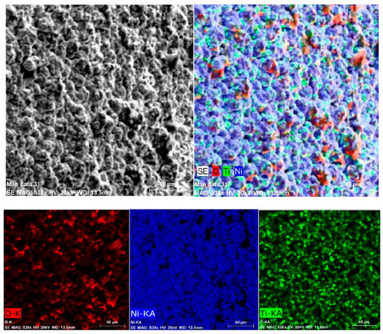 EDS mappings of Ni, Ti, and O elements for the Ni–TiO2 composite coatings (5 g/L of TiO2).