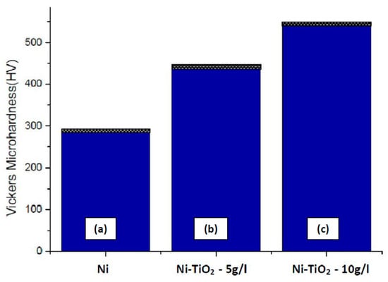 Vickers microhardness of the coated samples is shown in Figure 9. The Vickers microhardness of composite deposit Ni-layer coating is higher than the pure nickel coating. The incorporation of TiO2 in the deposit Ni-layer is one of the reasons to increase microhardness of the coatings. Further increase in microhardness of deposit Ni-layer by the incorporation of TiO2 is also clearly observed.