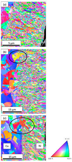 EBSD analysis of the electrodeposited Ni on copper without and with the addition of TiO2 was carried out and corresponding EBSD orientation maps are presented in Figure 10. EBSD inverse pole figure map, showing in color code the orientation of the observation direction (A3, from Figure 2) in the crystal coordinate system. The color of individual grains describes the {hkl} crystallographic plane parallel to the observation plane. These EBSD maps give a general view on both grain morphology and orientation. Some nickel grains are indicated by a circle in Figure 10b,c formed in continuity of copper grains, these first primary grains are developed by epitaxial deposition. The average grain size of the deposited layer did not vary with the incorporation of TiO2 and it can be estimated at 0.5 μm. However, some limited number of large grains were formed with the incorporation of TiO2 in the nickel layer (Figure 10b,c).