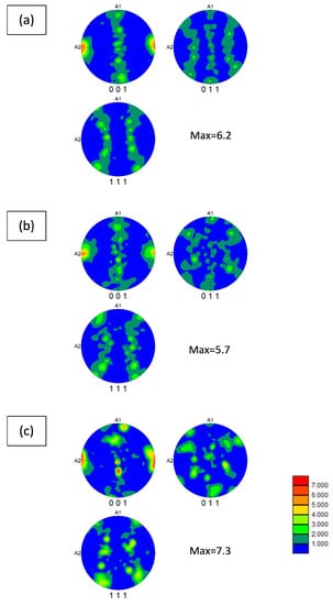 Pole figures of the electrodeposited Ni on copper (a) without and with the addition of TiO2, (b) 5 g/L of TiO2, (c) 10 g/L of TiO2.
