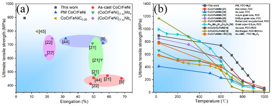 - Gali, A.; George, E.P. Tensile properties of high- and medium-entropy alloys. Intermetallics 2013, 39, 74–78. [Google Scholar] [CrossRef]
