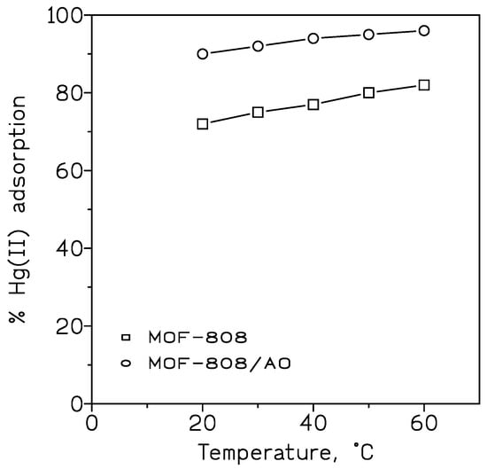 ZrO2 based metal-organic frameworks (MOF-808) were synthesized by a sol-gel method, and amidoxime (AO) functional groups were subsequently grafted to the MOF-808 surface by a wet chemistry process, resulting in MOF-808/AO []. Both products were used in the adsorption of Hg(II) from aqueous solution, and under different experimental variables such as, pH, temperature, reaction time, and initial metal concentration. The experimental data showed that the grafted material increased the metal uptake to 1.91 mmol/g against 1.71 mmol/g of the MOF-808 adsorbent (Figure 2).