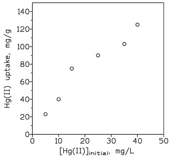 This B-80 biomass (algal cells cultivated in BG-11 medium containing phosphorous concentration of 80 mg/L) had the highest adsorption uptake of 0.475 mmol/g at pH 5, with the results fitted to the Langmuir isotherm model. Charred process was done under various temperatures, having the product processed at 300 °C the lowest Hg(II) leaching rate and without phosphorous released to the solution. A biomass (CSS) was used as Hg(II) adsorbent []. The adsorbent material was prepared by co-heating sublimed sulfur and raw corn stalk at 450 °C and 15 min, resulting in a product with 7.4% (in weight) sulfur. The maximum Hg(II) uptakes were of 1.34 and 0.59 mmol/g for CSS and BCS, respectively. Experimental results showed that in CSS, there was formation of irreversible Hg–S and Hg–O bonds. Desorption data were not included.