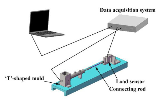 Figure 1 shows a T-shaped hot tearing acquisition device used to capture the shrinkage force and temperature of hot tearing initiation and propagation of the experimental alloys. When the molten alloys were poured into the T-shaped mold and cooled in air, the intersection between the sprue and the connecting rod was prone to stress concentration [26,27]. Generally, hot tearing may occur both inside and outside, and it is more difficult to evaluate internal tears than external tears. Therefore, the test mold is specially designed as a T-shape, so that only the external crack occurs at the corner of the T-shaped mold with the most concentrated thermal stress, and then HTS of the alloys with different compositions could be easily compared and evaluated.