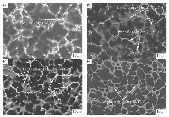 Some diffraction peaks of the parent phase and the second phase coincide, therefore the X-ray diffraction results need to be verified by other methods. Figure 4 shows microstructures and morphology of Mg–7Gd–5Y–xZn–0.5Zr alloys. It can be seen that the phase compositions of the four alloys were grey block α-Mg and one or two second phases precipitated along the grain boundary of the parent phase. As shown in Figure 4a, the second phase was Mg5(Gd,Y), which was a bright white fishbone phase and distributed at α-Mg grain boundary, as shown by the arrow. As shown in Figure 4b,c, the second phases were LPSO phase and W-phase, which were distributed in the grain boundary. As shown in Figure 4d, the second phase was almost all W-phase, which was distributed in the grain boundary in the form of network. The volume fraction of LPSO phase and W-phase in the second phase under different Zn content in Figure 4 was calculated by Image Pro Plus software. It was found that when Zn content was 3 wt%, the corresponding LPSO phase fraction was 18.3%, W-phase fraction was 4.6%; when Zn content was 5 wt%, the corresponding LPSO phase fraction was 21.2%, W-phase fraction was 12.6%; when Zn content was 7 wt%, the corresponding LPSO phase almost disappeared, W-phase fraction was 35.9%. It can also be seen from Figure 4 that the final grains size decreased significantly with the increase of Zn content, which should be beneficial to the reduction of HTS [10,36].
