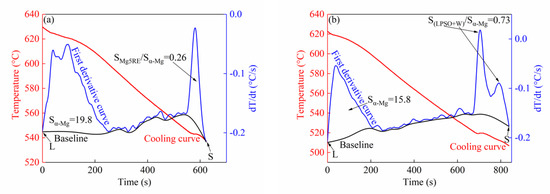- Li, J.L.; Chen, R.S.; Ma, Y.Q.; Ke, W. Computer-aided cooling curve thermal analysis and microstructural characterization of Mg–Gd–Y–Zr system alloys. Thermochim. Acta 2014, 590, 232–241. [Google Scholar] [CrossRef]