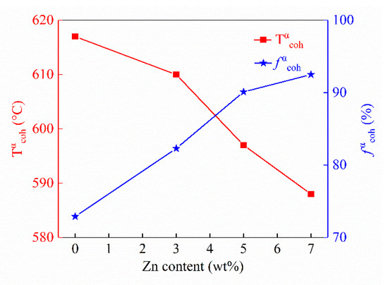 There was no doubt that the effect of the increase of Zn content on the crystallization mode of the parent phase will also be reflected in its solidification path. According to the temperature (Tαcoh) or solid fraction (fαcoh) corresponding to the dendrite coherent time, the solidification of alloy can be divided into two stages, which can be used to characterize the α-Mg behavior [30]. Generally, the higher the Tαcoh (or the lower the fαcoh) is, the longer the stage of intergranular feeding relative to free feeding is. Figure 6 shows the change of Tαcoh and fαcoh with Zn content in Mg–7Gd–5Y–xZn–0.5Zr alloys. It can be seen that when Zn content was 0 wt%, 3 wt%, 5 wt% and 7 wt%, Tαcoh was 617, 610, 597 and 588 °C, which corresponded to fαcoh of 72.9%, 82.3%, 90.1% and 92.5%, respectively.