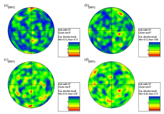 Electron back scatter diffraction (EBSD) pole figures of Mg–7Gd–5Y–xZn–0.5Zr alloys: (a) x = 0 wt%; (b) x = 3 wt%; (c) x = 5 wt%; (d) x = 7 wt%.