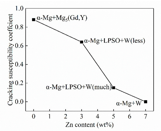 Figure 9 shows the theoretically CSC values calculated based on the Clyne-Davies’ model for predicting HTS of Mg–7Gd–5Y–xZn–0.5Zr alloys. The various parameters such as t0.01 were determined by thermal analysis method, and then the parameters were brought into Equation (1) to calculate the CSC values. It can be seen, CSC values of the investigated Mg–7Gd–5Y–xZn–0.5Zr (x = 0, 3, 5, 7 wt%) alloys were 0.88, 0.64, 0.15 and 0, respectively. The HTS of the tested alloys predicted by CSC values were obtained in the following order: Mg–7Gd–5Y–0.5Zr > Mg–7Gd–5Y–3Zn–0.5Zr > Mg–7Gd–5Y–5Zn–0.5Zr > Mg–7Gd–5Y–7Zn–0.5Zr. It can be seen that when Zn content was 3 wt%, 5 wt% and 7 wt%, HTS can be reduced by 27%, 83% and 100%, respectively, that is to say, Zn can significantly reduce HTS of Mg–7Gd–5Y–0.5Zr alloy, which almost linearly decreased with the Zn content.