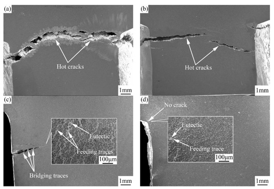Figure 11 shows the micrographs near to the hot tearing region of T-shaped specimen of Mg–7Gd–5Y–xZn–0.5Zr alloys. It can be seen from Figure 11a–c that the cracks began from the surface of the specimen to penetrate into the interior, and the crack size decreased with the increase of Zn content.