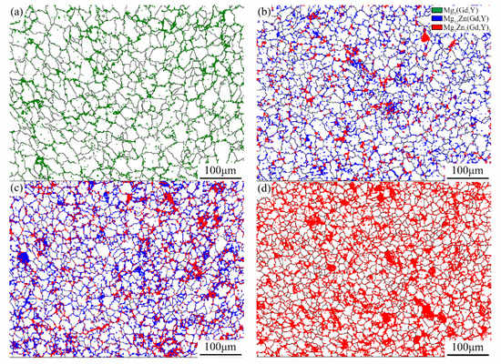 As shown by Figure 12, green represents Mg5(Gd,Y) phase, blue represents LPSO phase and red represents W-phase. It was not difficult to see that the grain refinement of α-Mg increased with the increase of Zn content. When α-Mg crystallization has ended and the second phase has not yet precipitated, the residual liquid phase on the grain boundary also increased with the increase of Zn content. The mechanism of grain refinement with Zn content can be seen from the displacement of α-Mg peaks in Figure 3 above. The calculated lattice parameters of α-Mg vary with Zn content as shown in Table 4. It can be seen that the lattice constants a and c of α-Mg decreased, while the axial ratio c/a increased, with the increase of Zn content, which indicated that the solid solubility of Gd and Y decreased with the increase of Zn content.