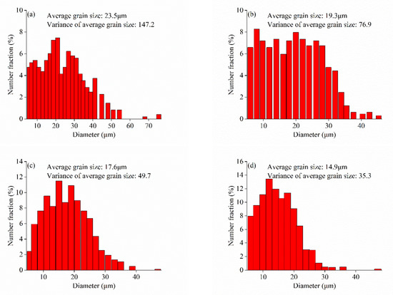 Tαcoh is the critical temperature for the solidification liquid feeding mechanism to change from global free feeding to local intergranular feeding, so the lower Tαcoh is, the lower HTS is. In addition, when the temperature is lower than Tαcoh, the grain size will determine the size and thickness of the residual liquid film, as well as the solidification shrinkage stress of α-Mg, thus determining the HTS level of the alloy. The change of grain size and its variance with Zn content are shown in Figure 12 and Figure 13. It can be seen that when Zn content was 0 wt%, 3 wt%, 5 wt% and 7 wt%, the average grain size was 23.5, 19.3, 17.6 and 14.9 μm, and the corresponding variance was 147.2, 76.9, 49.7 and 35.3, respectively.