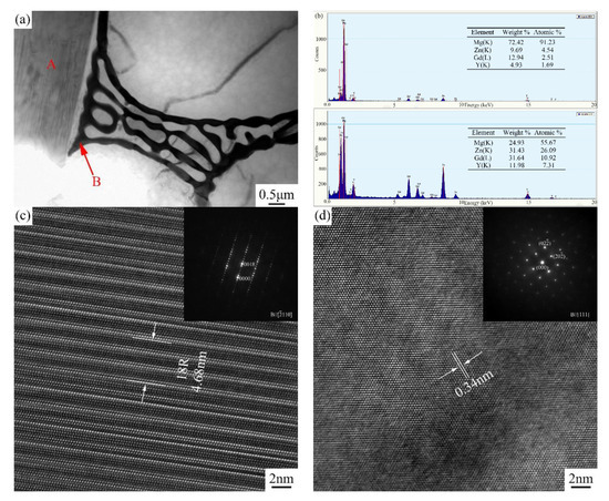 Figure 14 shows TEM observations and correspond EDS results and the selected area electron diffraction (SAED) patterns of the phases in Mg–7Gd–5Y–5Zn–0.5Zr alloy. Combined with the EDS results, the blocked-shaped phase had a composition with Zn/RE ratio of about 1, it was inferred that the block-shaped phase (marked by A in Figure 14a) consisted of 18 R LPSO phase. In addition, the fishbone-shaped phase (marked by B in Figure 14a) consisted of W-phase. The HRTEM images and SAED patterns shown in Figure 14c,d further demonstrated that the block-shaped phase was 18 R LPSO phase and the fishbone-shaped phase was W-phase with face-centered cubic structure. The accuracy of XRD results was also identified. It also can be seen from the SAED of LPSO phase, LPSO phase had a coherent lattice relationship with the α-Mg matrix ((0001)α-Mg//(0018)18R-Mg), which meant that LPSO phase at grain boundary played a strong pinning role on both sides of α-Mg grain and inhibited hot tearing at the grain boundaries.