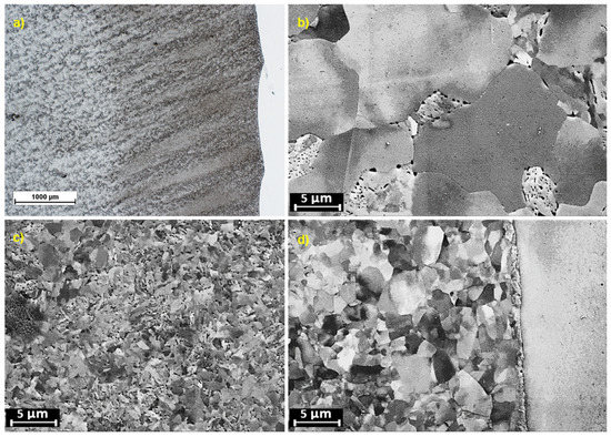 Samples from the LAS base material, HAZ, PMZ, UMZ and the weld metal, respectively, were prepared by electrical discharge machining (EDM). Samples were ground with Struers SiC grinding papers up to 4000 grit and then polished with 3 μm, 1 μm, and 0.25 μm Struers DiaPro diamond dispersions. Final polishing with vibratory polishing in colloidal silica alkaline suspension removed the last deformation layers from grinding. Optical microscopy (OM) and scanning electron microscopy (SEM) were used to characterize the microstructures. Electron backscatter diffraction (EBSD) was applied for grain size measurement with a step size of 60 nm. Energy dispersive X-ray spectroscopy (EDS) was utilized to characterize the composition gradients at the weld interface with 10 keV accelerating voltage. Instrumented microhardness and nanoindentation measurements were carried out to study the hardness profiles across the LAS HAZ and the weld interface. Microhardness measurements were done with a Vickers tip using an indentation load of 350 mN and a step size of 50 µm (pause: 10 s and loading rate: 750 mN/min), while nanoindentation measurements were performed with a Berkovich tip using an indentation load of 1.5 mN and a step size of 5 µm (pause: 10 s and loading rate: 7.5 mN/min). In addition, HV0.5 was used for microhardness measurement with the indentation weight of 500 g on the reference state. Otherwise, HVIT is used in this work to describe the hardness value both from microhardness and nanoindentation measurements but with a different physical meaning. In all figures and hardness profiles, the LAS is shown on the left and Alloy 52 weld metal on the right, with the fusion boundary (FB) at the X = 0 position on the x-axis.