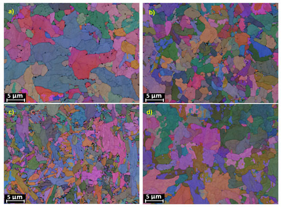 EBSD mapping of the microstructures in the LAS HAZ of the NIWEL 5000 h condition, at different distances from the FB. Progressive grain refining of distance from (a) 2500, (b) 1000 to (c) 300 µm to FB, and grain coarsening at (d) 30 µm to the FB were observed.