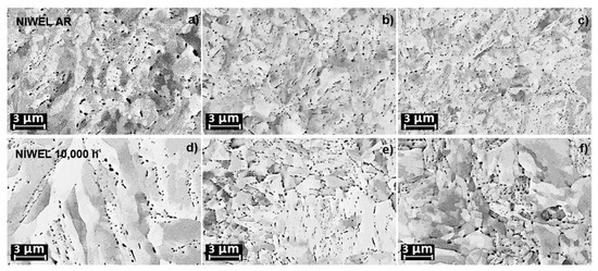 EBSD maps of NIWEL 5000 h in Figure 3 reveal the progressive grain refining from 2500 to 300 µm distances from the interface, and the grain coarsening near the FB. The grain size in the LAS changes from about 2.5 µm in the base material to about 1.5 µm in the grain-refined zone and back to 2.5 µm in the CDZ. Hardness is affected by the accommodation of strain in the area of contact under the indenter tip and therefore by the sub-grain size which is reported in this paper with EBSD. No significant changes in the grain size due to thermal ageing were observed when comparing the AR and aged NIWEL DMW mock-up samples. Figure 4 shows a comparison of the precipitates in NIWEL AR and NIWEL 10,000 h at increasing distances from the FB. No changes in carbide precipitation were thus observed upon thermal ageing. As seen in Figure 5, the hardness profile across the LAS HAZ is clearly affected by the grain size. Since the thermal ageing at 400 °C for 10,000 h does not affect the grain size or carbide precipitation, there are no changes in the hardness level either.