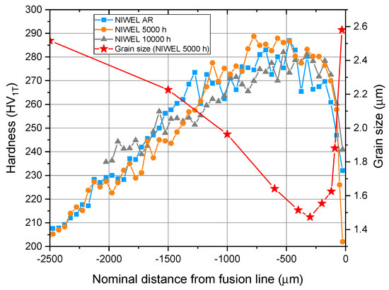 Comparison of the hardness profiles across the LAS HAZ in the NIWEL DMW before and after thermal ageing at 400 °C for 5000 and 10,000 h, showing a clear correlation with the grain size profile.