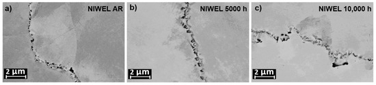 SEM imaging of grain boundaries (GBs) in Alloy 52 weld metal from the NIWEL mock-up before (a) and after ageing at 400 °C for 5000 (b) and 10,000 h (c). No clear signs of GB carbide growth were observed.