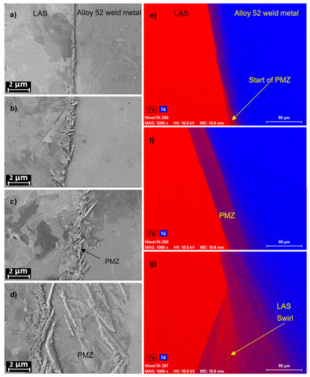 SEM imaging of the growth of the partially-melted zone (PMZ) layer from (a) a straight fusion line to (d) a rather large (about 10 µm) PMZ, and EDS maps showing the increase in iron dilution into the weld metal from (e) the start of PMZ to (g) a LAS swirl. The beginning of the weld pass increases the width of the PMZ and the dilution of iron (red) from the LAS to the nickel-rich (blue) weld metal.
